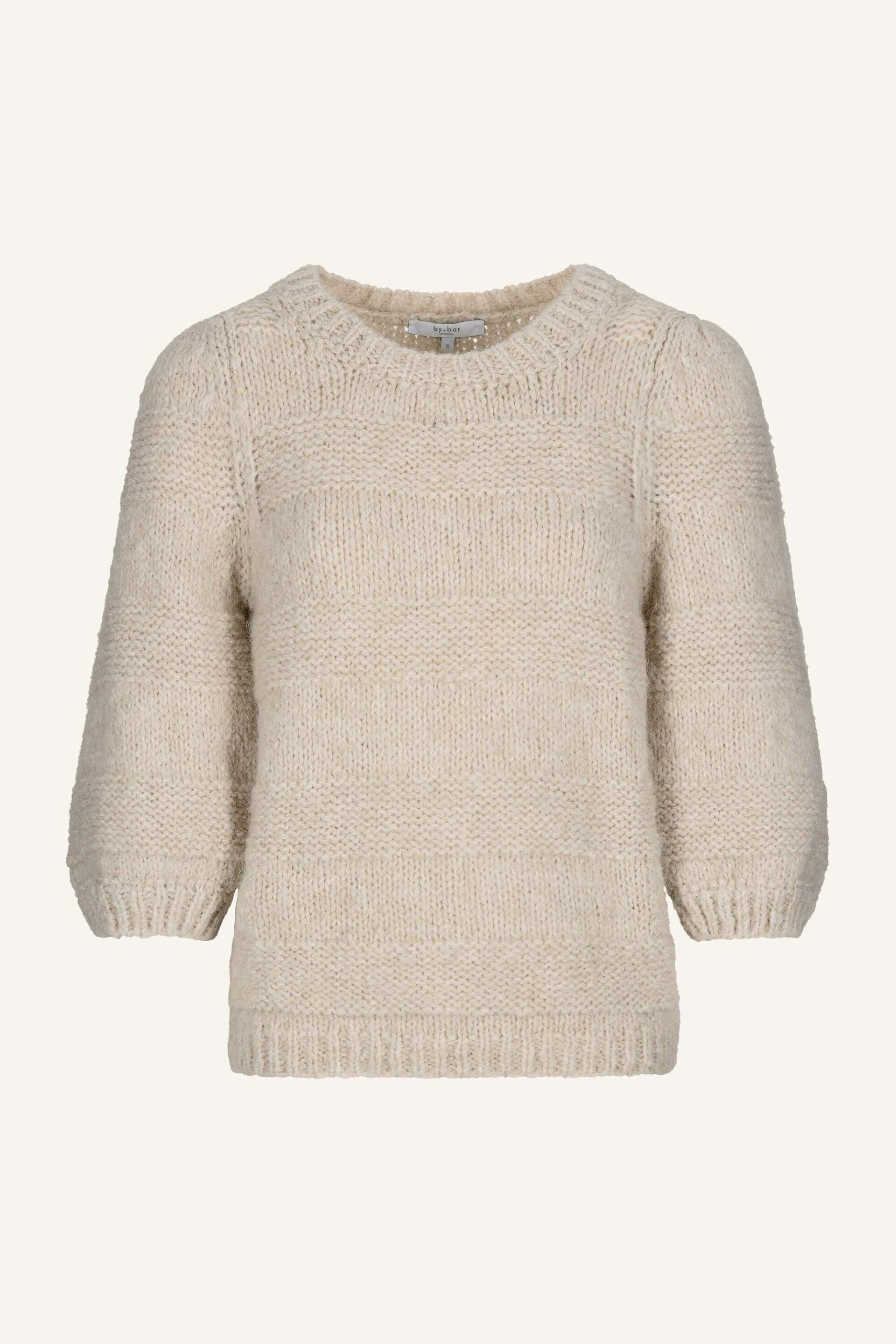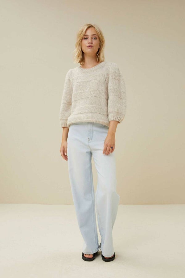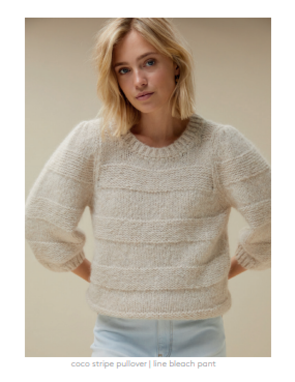 deze zachte trui is gemaakt van een fijne wolblend, met onder andere alpaca wol. de samenstelling van de stof maakt de trui stevig en super comfy. daarbij is de trui zo gebreid dat er een gestreept patroon ontstaat . de coco stripe pullover heeft een driekwart mouw en is afgewerkt met een rib boord aan de hals, onderkant van de mouwen en aan de onderkant van de trui.