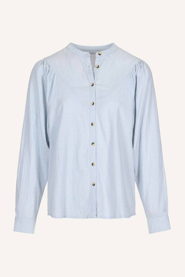 deze luchtige blouse heeft een recht model. de onderkant is rond afgewerkt en valt iets langer aan de achterkant. de zachte katoen kwaliteit en de plootjes aan de mouwen geeft de blouse een feminine touch.