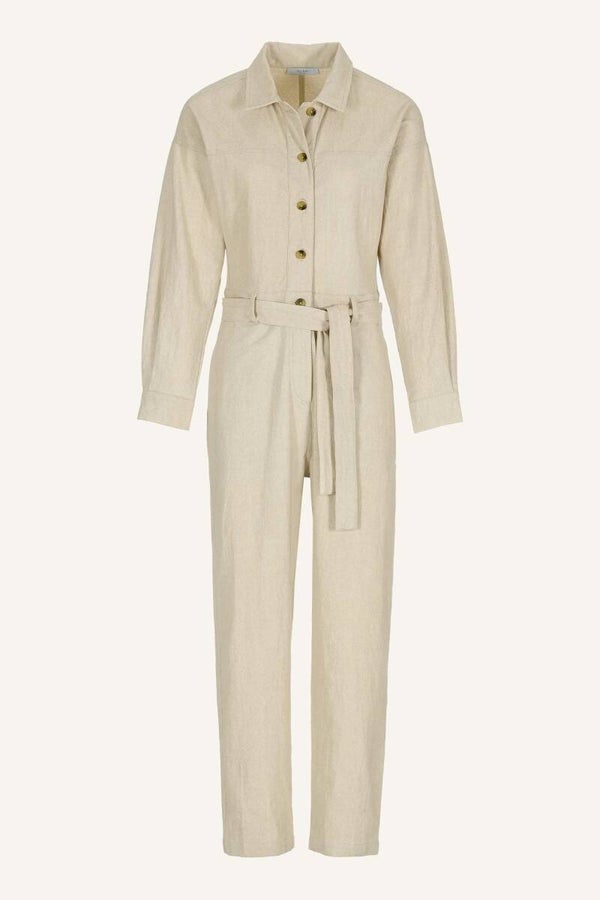 deze stoere jumpsuit is gemaakt van een mooie 100% katoen kwaliteit. Naast zijn stoere uitstraling, heeft de jumpsuit ook een feminine look door de iets aangesloten taille voorzien van een aansluitende waistband. De jumpsuit heeft een knoopsluiting aan de voorkant een een lange mouw en twee grote zakken aan de voorkant op ongeveer heuphoogte.
