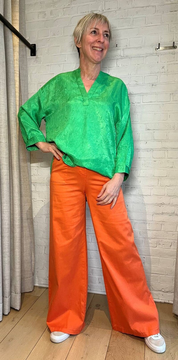 Relaxed overhemd zonder kraag in een glanzende kwaliteit. Het hemd heeft een diepe v-halslijn geïnspireerd op een tuniek en 3/4 mouwen. Materiaal: 100% Polyester