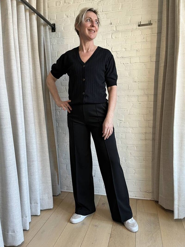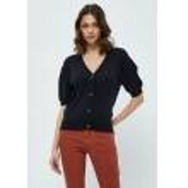 Stijlvolle cardigan met ribpatroon. De cardi heeft korte mouwen / lichte poefmouw. Het heeft een v-hals en wordt gesloten door middel van knopen. Samenstelling: 80% Viscose (EcoVero), 20% Nylon kleur : zwart
