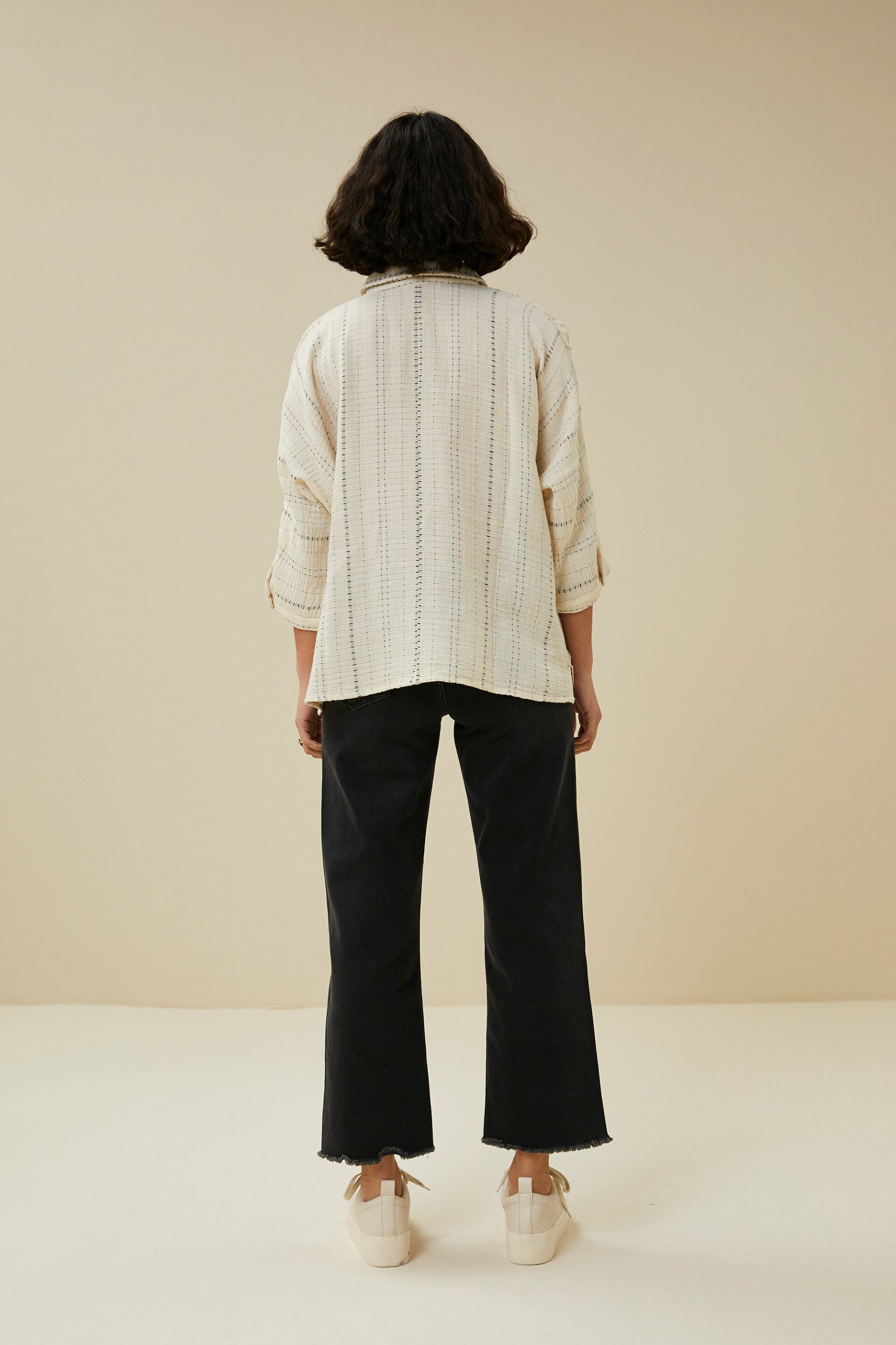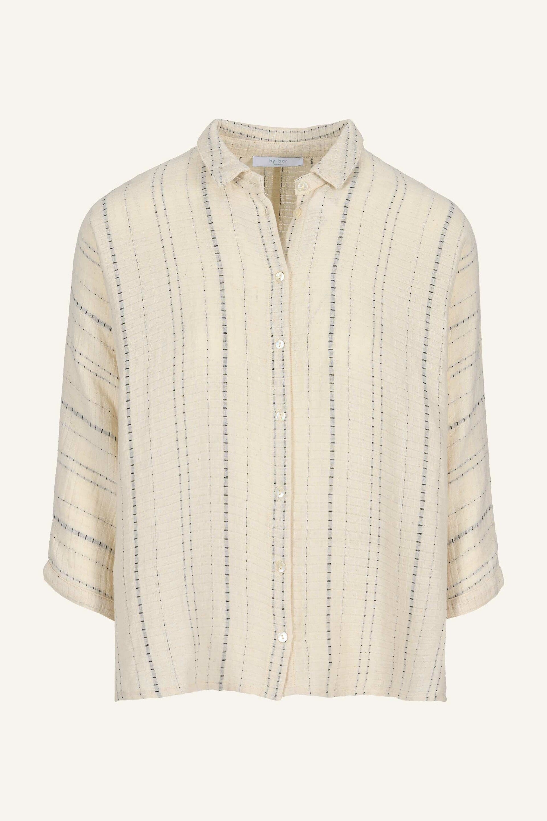Heerlijke luchtige, ruimvallende blouse. De blouse heeft een klein kraagje en driekwart mouwen; daarbij is er een lichte streep verwerkt in de opdruk. De blouse heeft aan beide zijkanten onderin een splitje. De wafelstructuur van het materiaal geeft de blouse een rijke uitstraling.