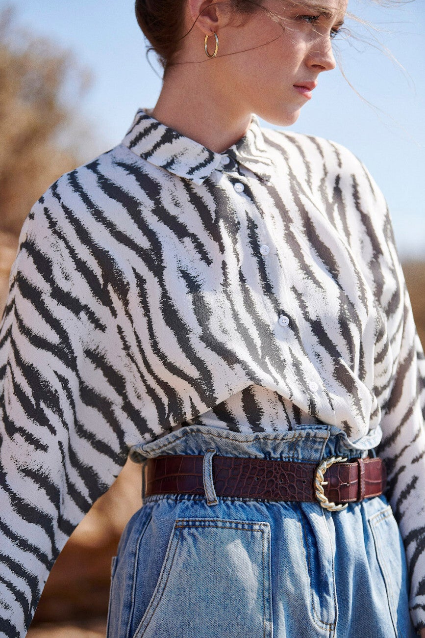 Blouse met 3/4 vleermuismouwen in zebraprint. De blouse heeft manchetten met een knoop - Lengte vanaf de schouder 62 cm voor en 73 cm achter Materiaal: 100% Viscose