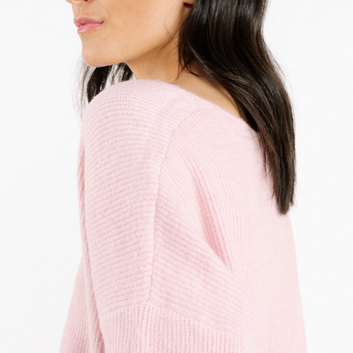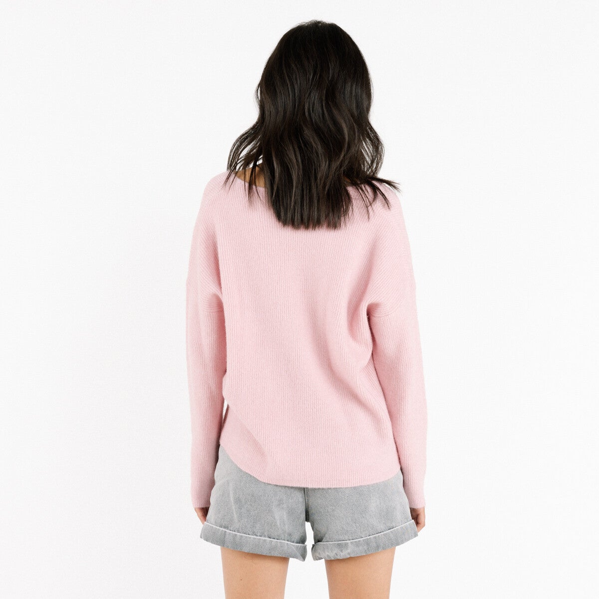 roze trui met lange mouwen, v-hals en verlaagde schouders. Losse pasvorm