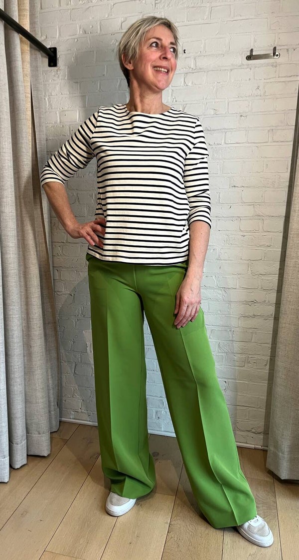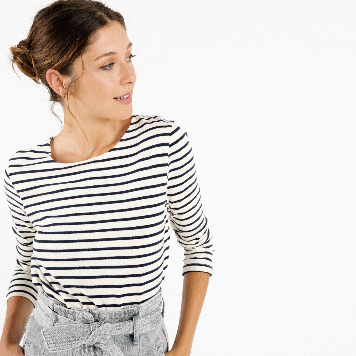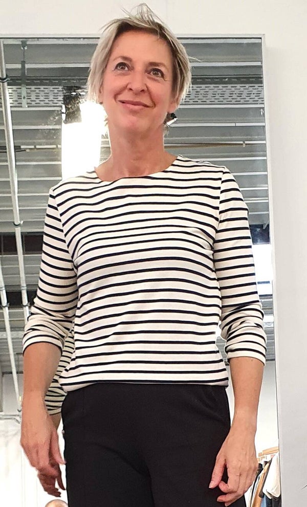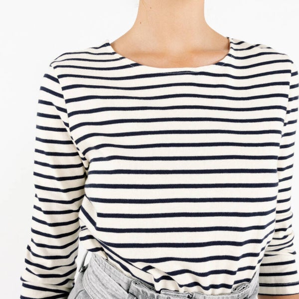 gestreept truitje met lange mouwen. Het truitje heeft een ronde kraag en knoopsluiting aan de achterkant.