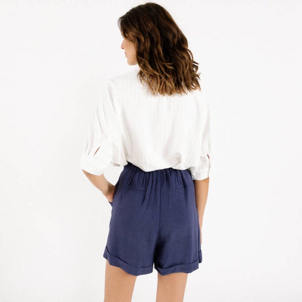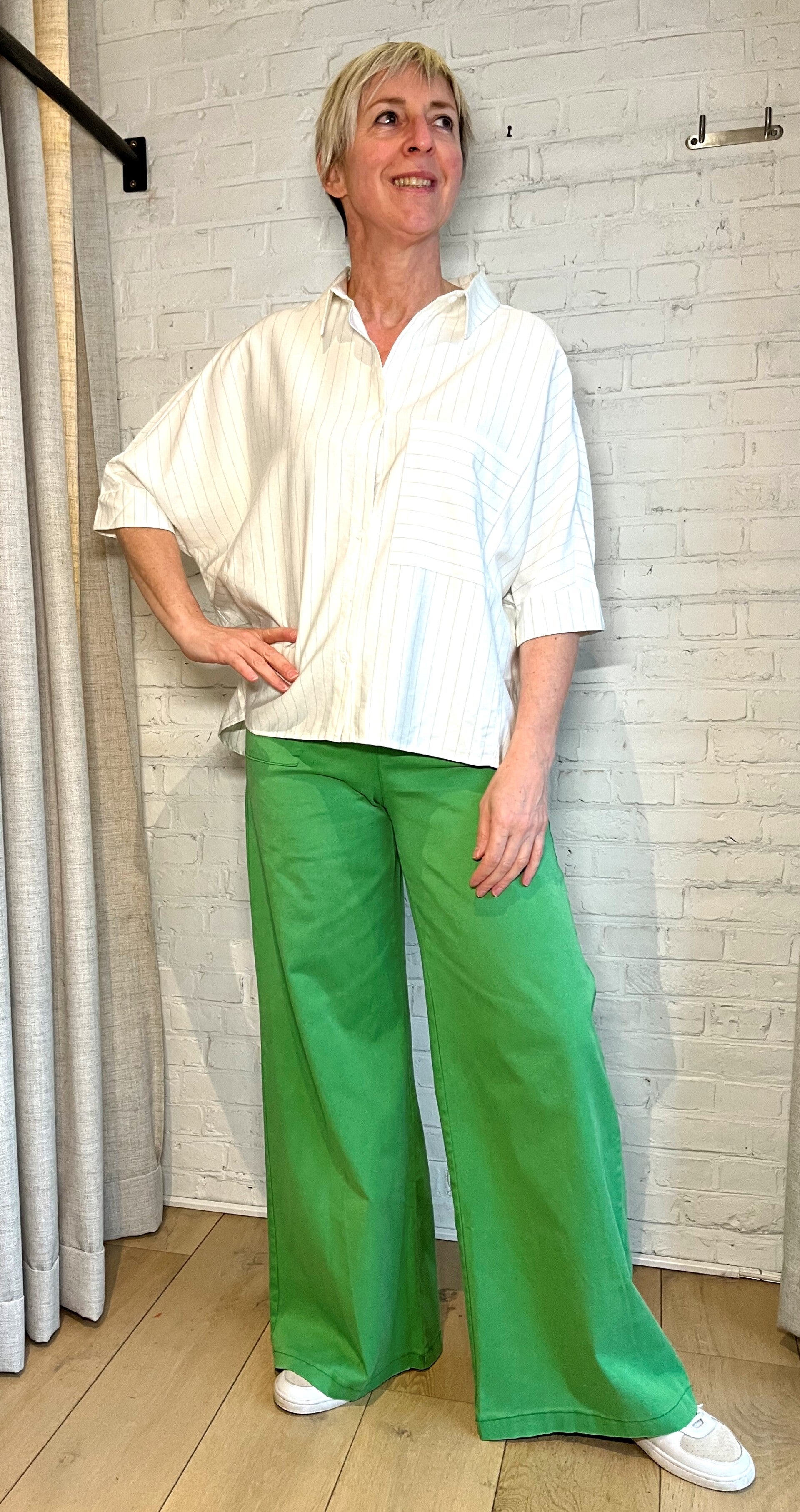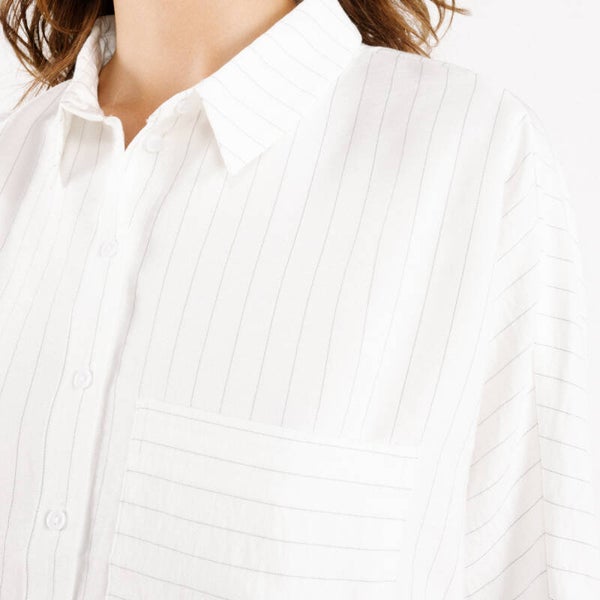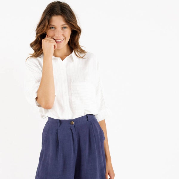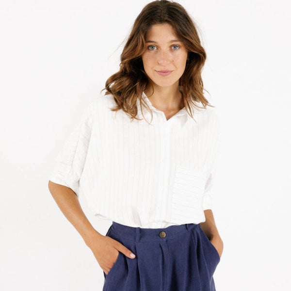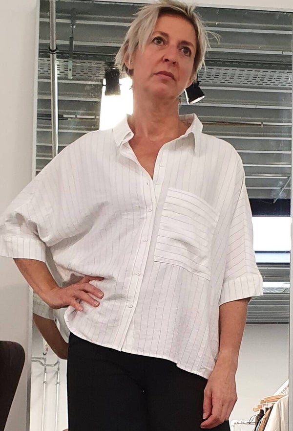 losoverhemd met fijne verticale krijtstrepen. Het hemdje heeft wijde mouwen en een borstzak.