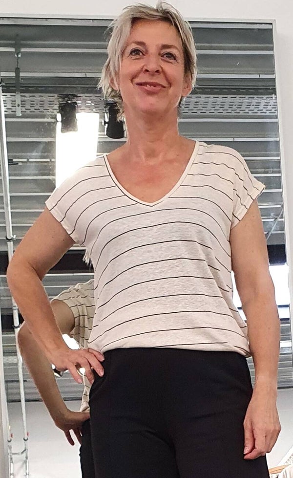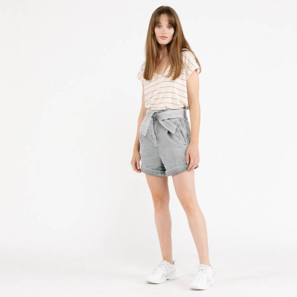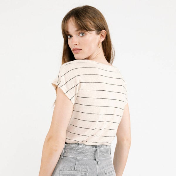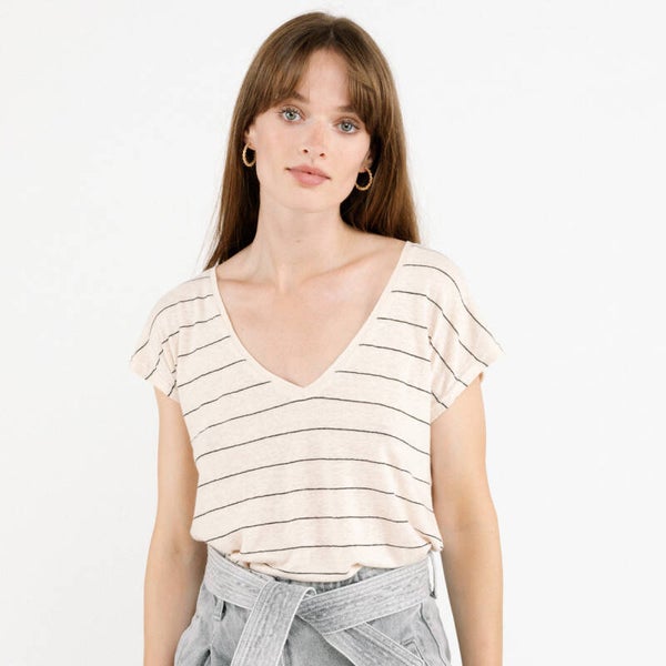 gestreept t-shirtje met korte mouwen en v-hals De t-shirt heeft een losse pasvorm