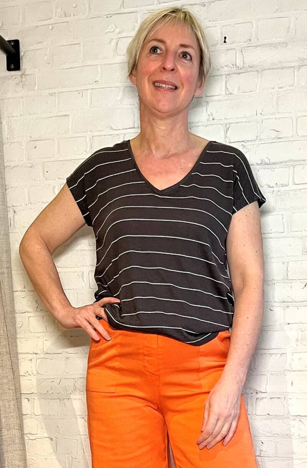gestreept t-shirtje met korte mouwen en v-hals De t-shirt heeft een losse pasvorm
