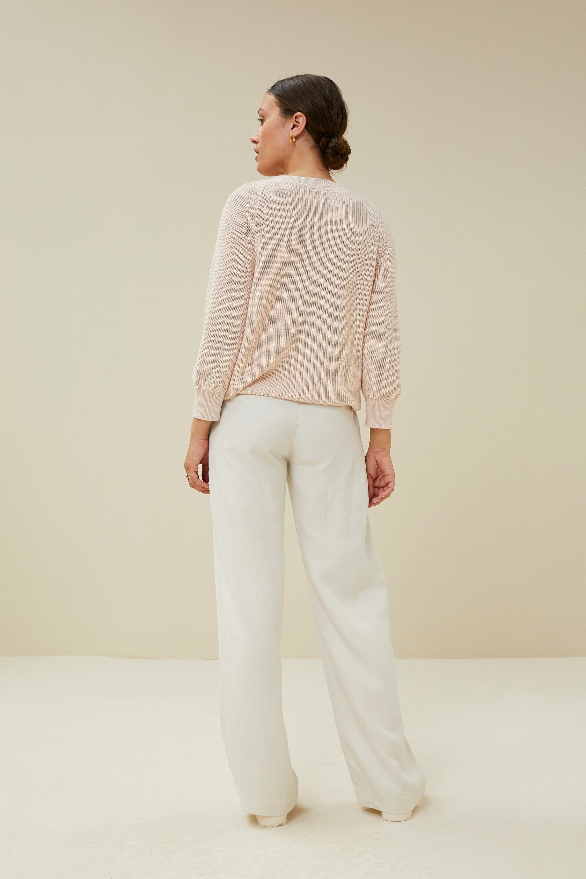 Deze zalmroze trui is een combinatie van klassiek en feminine, met een moderne twist. het verfijnde breipatroon in combinatie met de diepe v-halslijn en ribboorden zorgen ervoor dat je de perfecte classic look kunt creëeren. De trui is gemaakt van organic katoen. Hij heeft vleermuismouwen en een rechte fit.