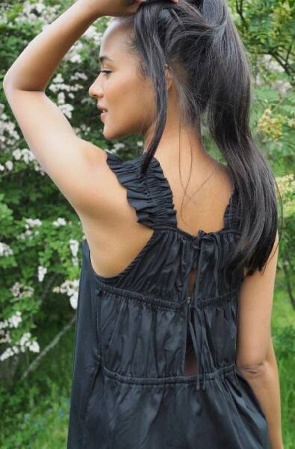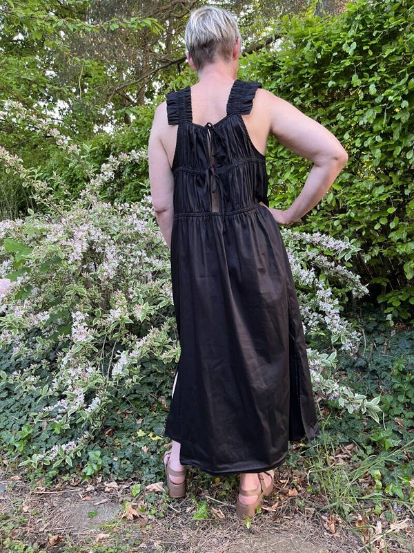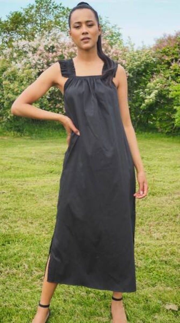 Deze schoonheid is gemaakt van zijdeachtig katoen. De perfecte jurk voor de overgang van dag naar nacht met een simpele verandering van schoenen en accessoires! De jurk is gemaakt uit een zijdezachte katoenmix. Hij heeft gerimpelde en elastische schouderbanden
