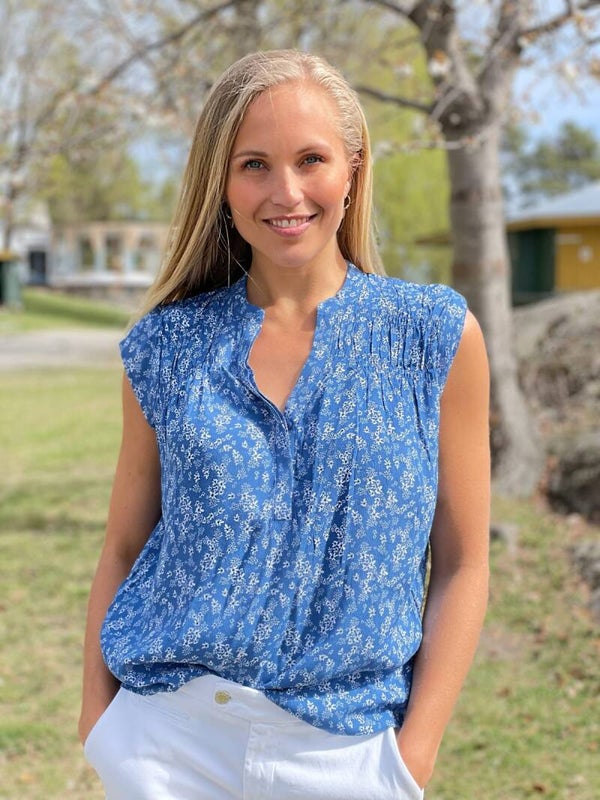 Prachtig topje in blauwe bloemenprint.De top heeft een v-hals en verborgen knoopjes. Heerlijk luchtig blousje. Ideaal voor warme zomerdagen.