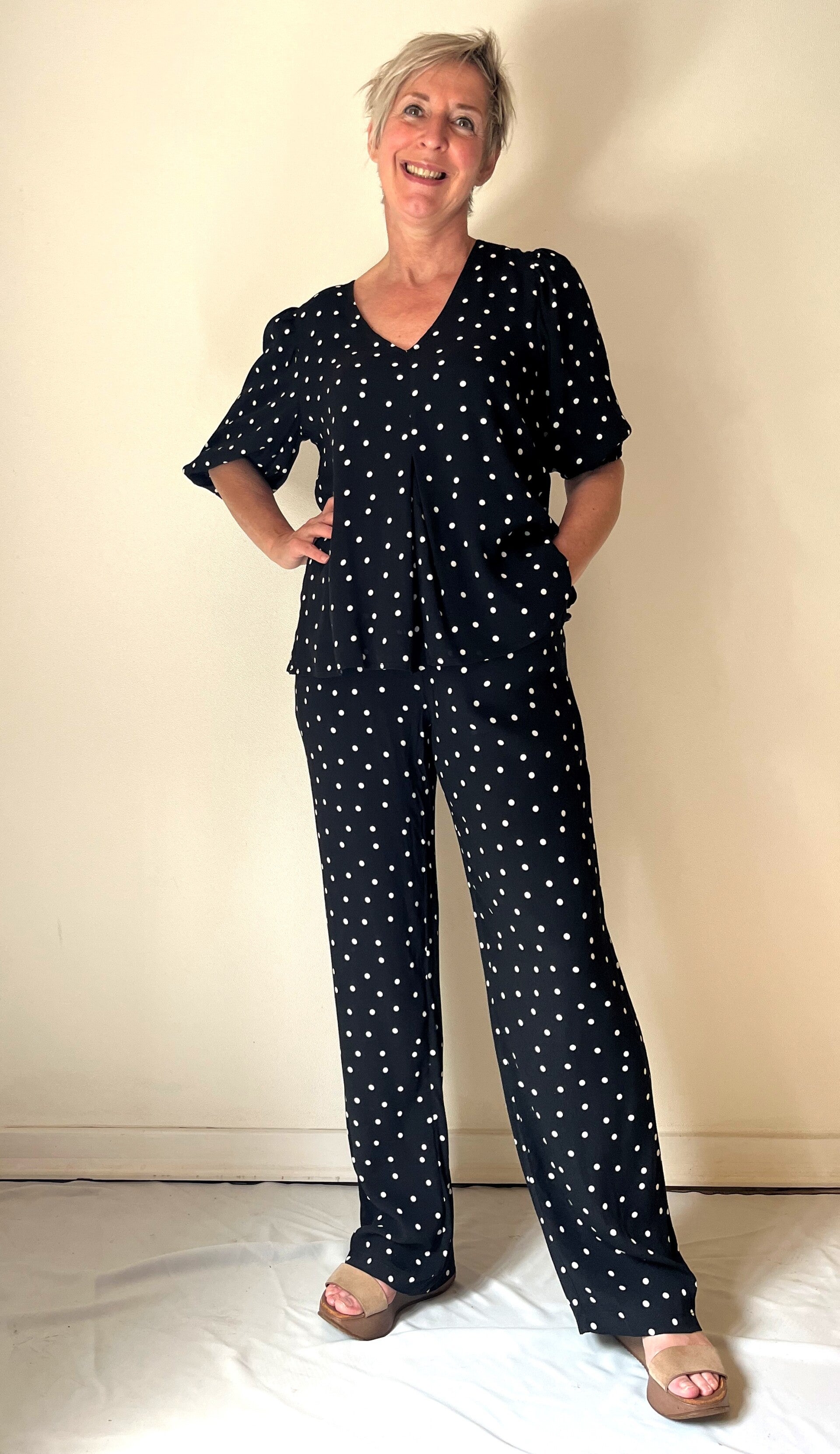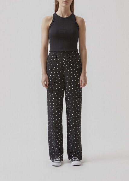 zwarte broek met elastische taille en bolletjesmotiek. De broek heeft een elastische taille en zakken.