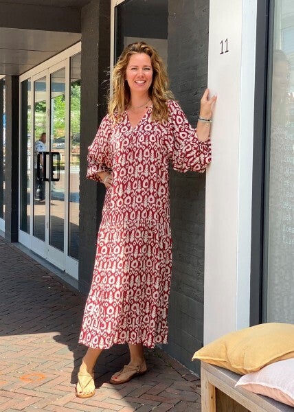 Wij houden van het boho gevoel dat ikat-geïnspireerde dessins met zich meebrengen. Deze prachtjurk doet daar nog een schepje bovenop met zijn zwierig A-lijn silhouet dat is opgebouwd uit aangerimpelde stroken. De jurk is gemaakt van een soepele, middelzware viscose kwaliteit met subtiele crinkle-structuur en ontworpen in een kleurstelling van bordeauxrood, fuchsia en ecru.