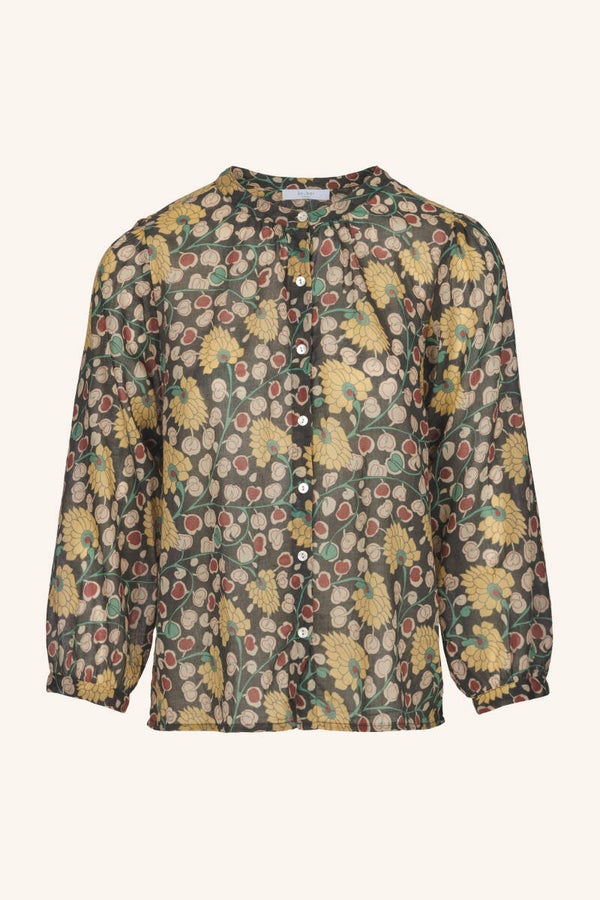 Luchtige blouse met een rechte fit en een pofmouw . De blouse heeft lange mouwen en een knoopsluiting aan de voorzijde. Ze is rond afgewerkt aan de onderkant en heeft een prachtig handgeprint motief. De blouse is gemaakt in een fijne katoen kwaliteit.