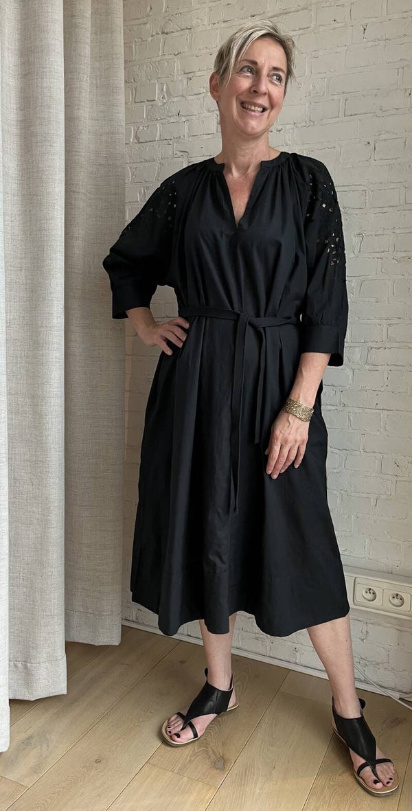 Deze prachtige zwarte jurk krijgt een romantische uitstraling door de mouwen met embroidery details. Hij is gemaakt van een fijne katoen kwaliteit. Door de losse pasvorm en zakken aan de zijkanten krijgt hij een casual en elegante look and feel. Style de jurk af met het bijgeleverde koord als je je taille wil benadrukken. Ook zonder lintje is hij top