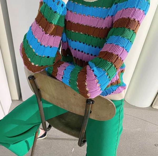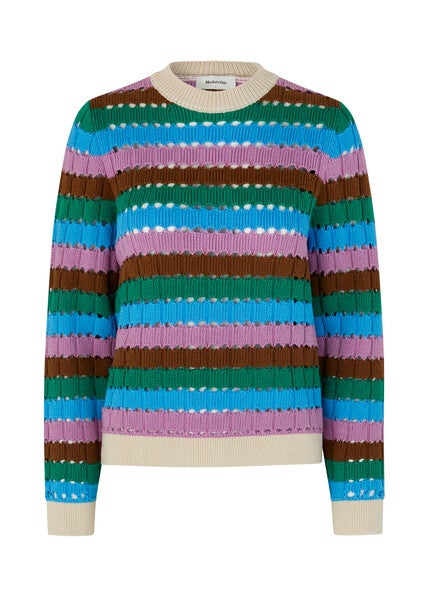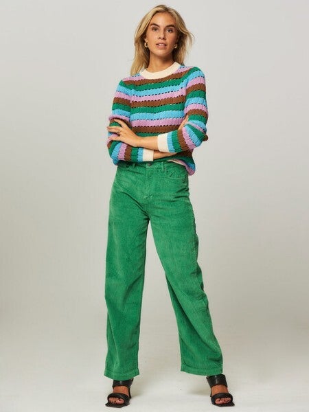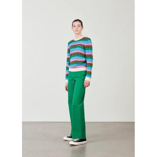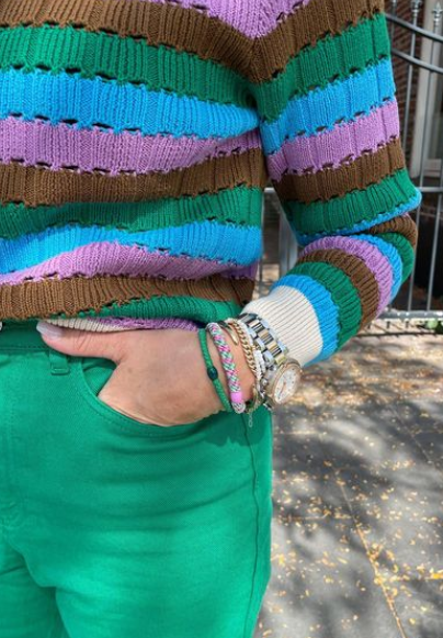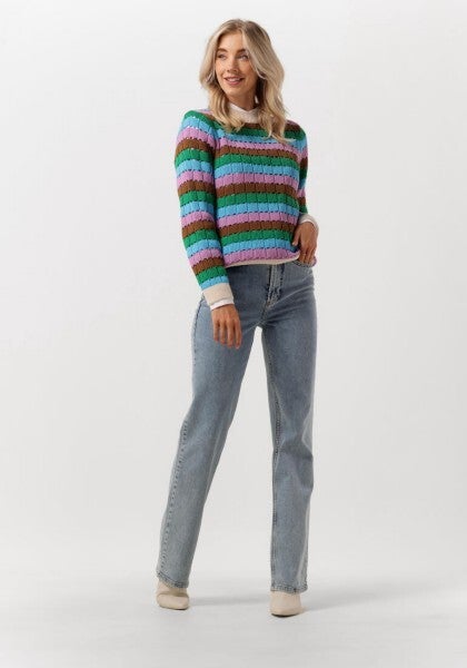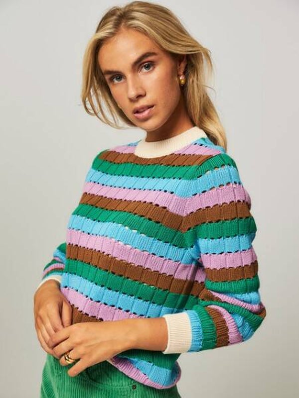 Musthave alert! Hoe geweldig is deze gestreepte trui van organisch katoen. Hij heeft een ronde hals en een mooi gekleurd patroon. Combineer de trui met een groene jeans en je bent helemaal ready to go!