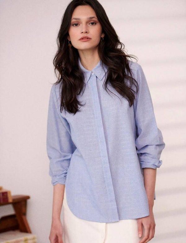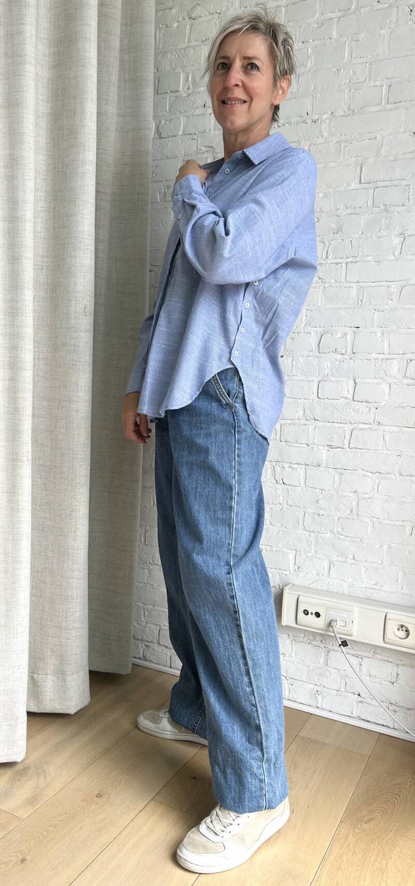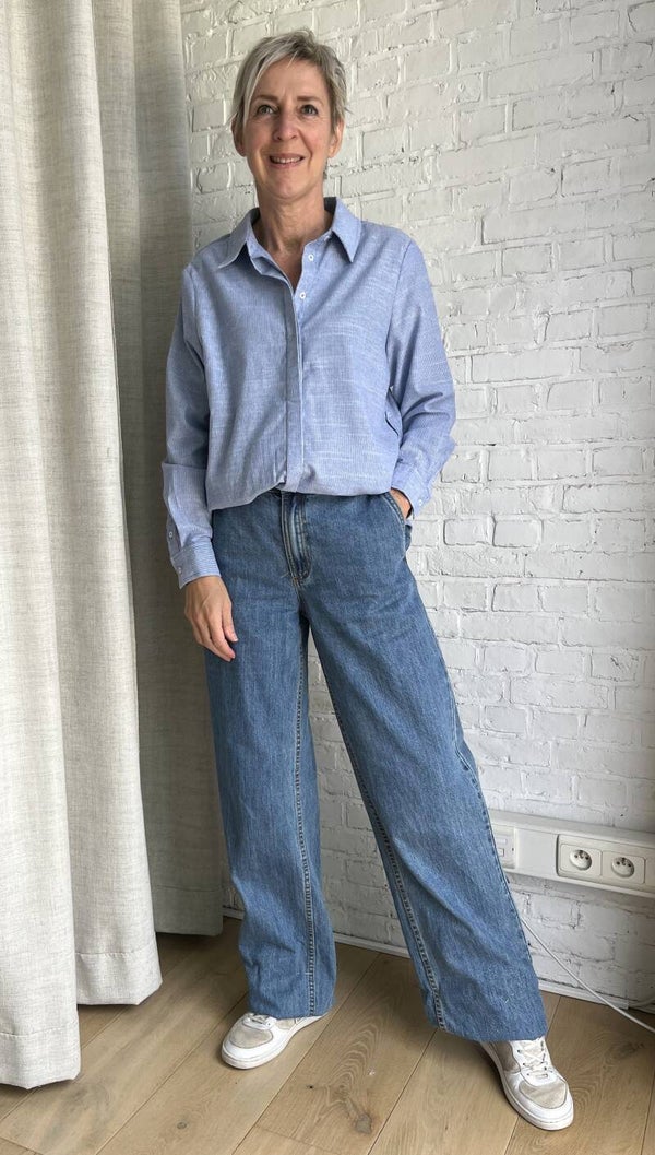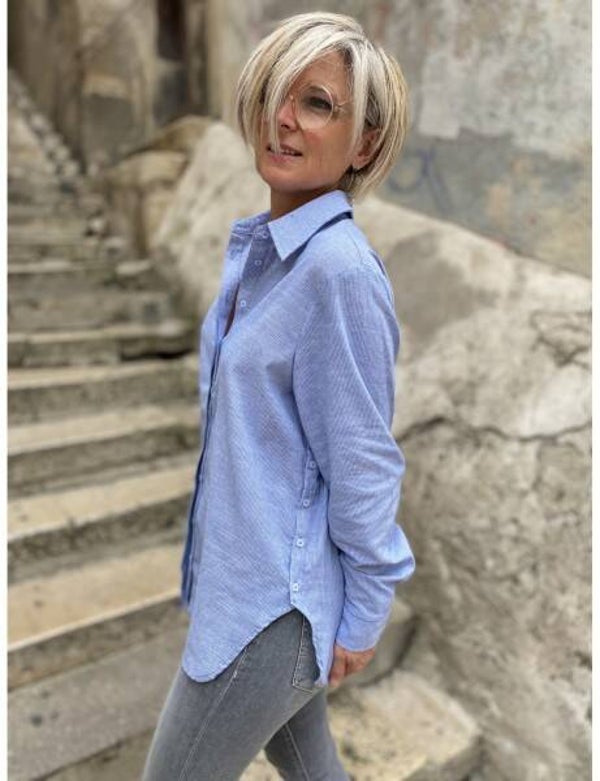 Denimbauwe blouse met lange mouwen - Afgeronde onderkant met knoopsluiting en knopen aan de zijkanten - Verborgen sluiting met knopen middenvoor - Manchet met 2 knopen - Klassieke kraag Materiaal: 80% katoen en 20% polyester