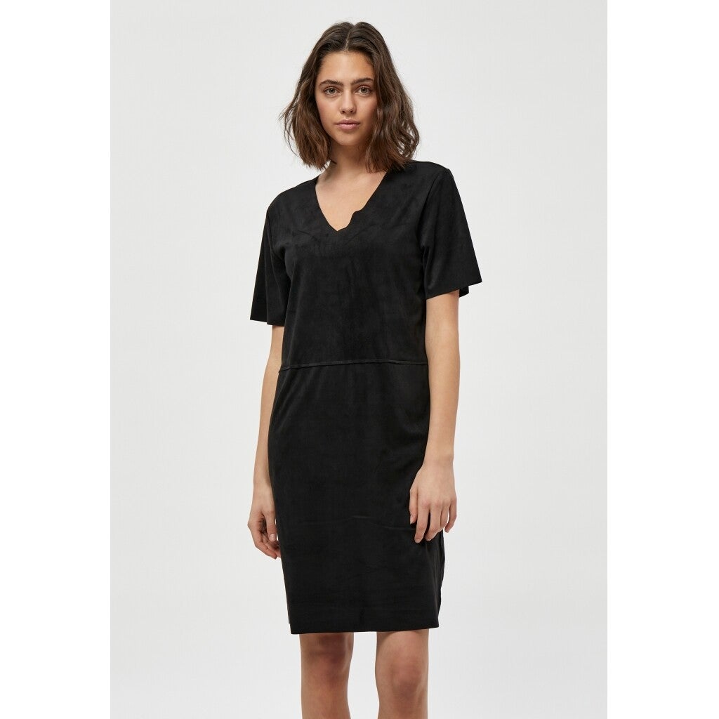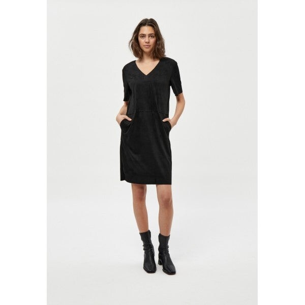 Jurk met een v-hals en korte mouwen. De jurk heeft steekzakken en een losse pasvorm.