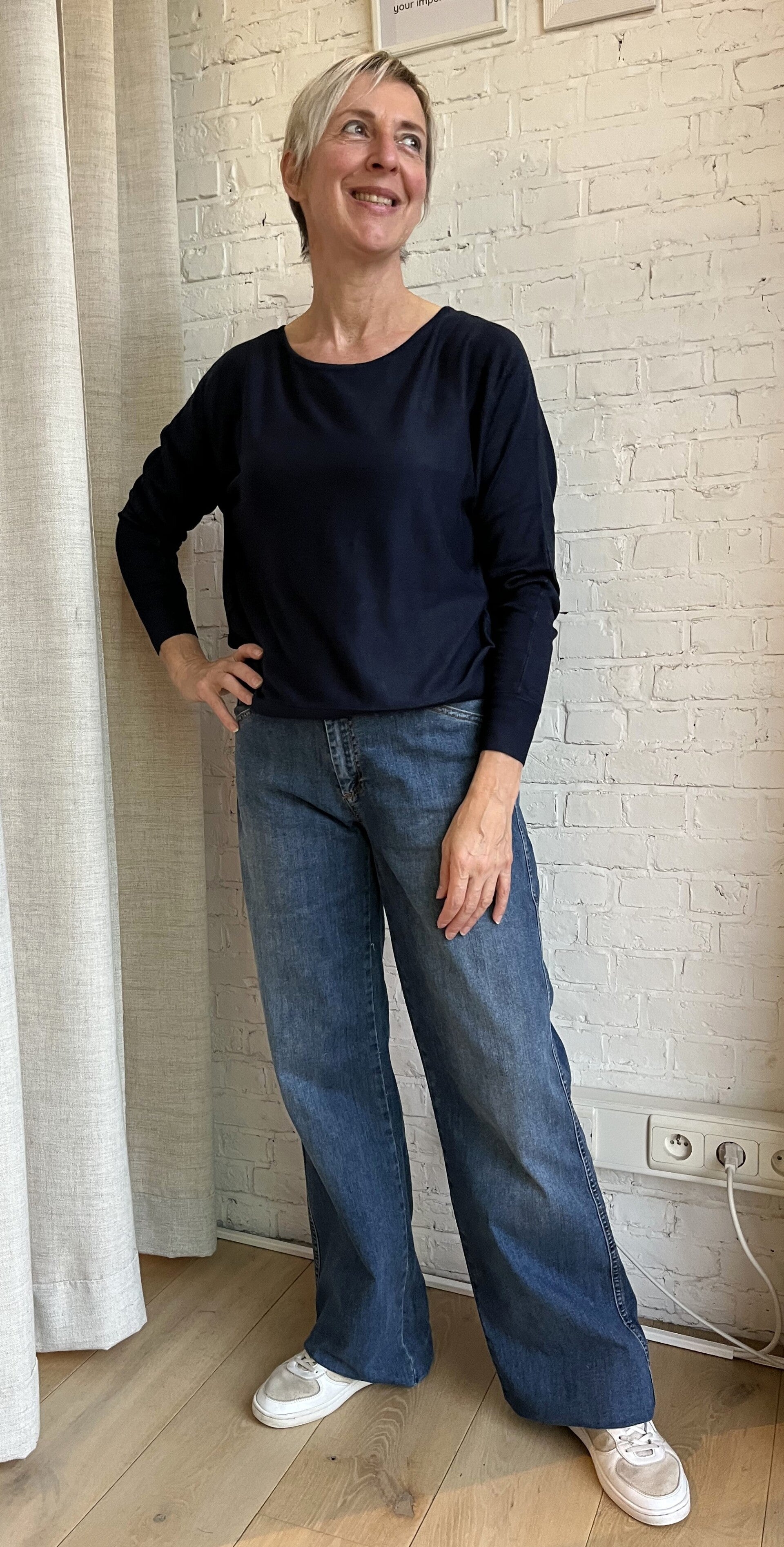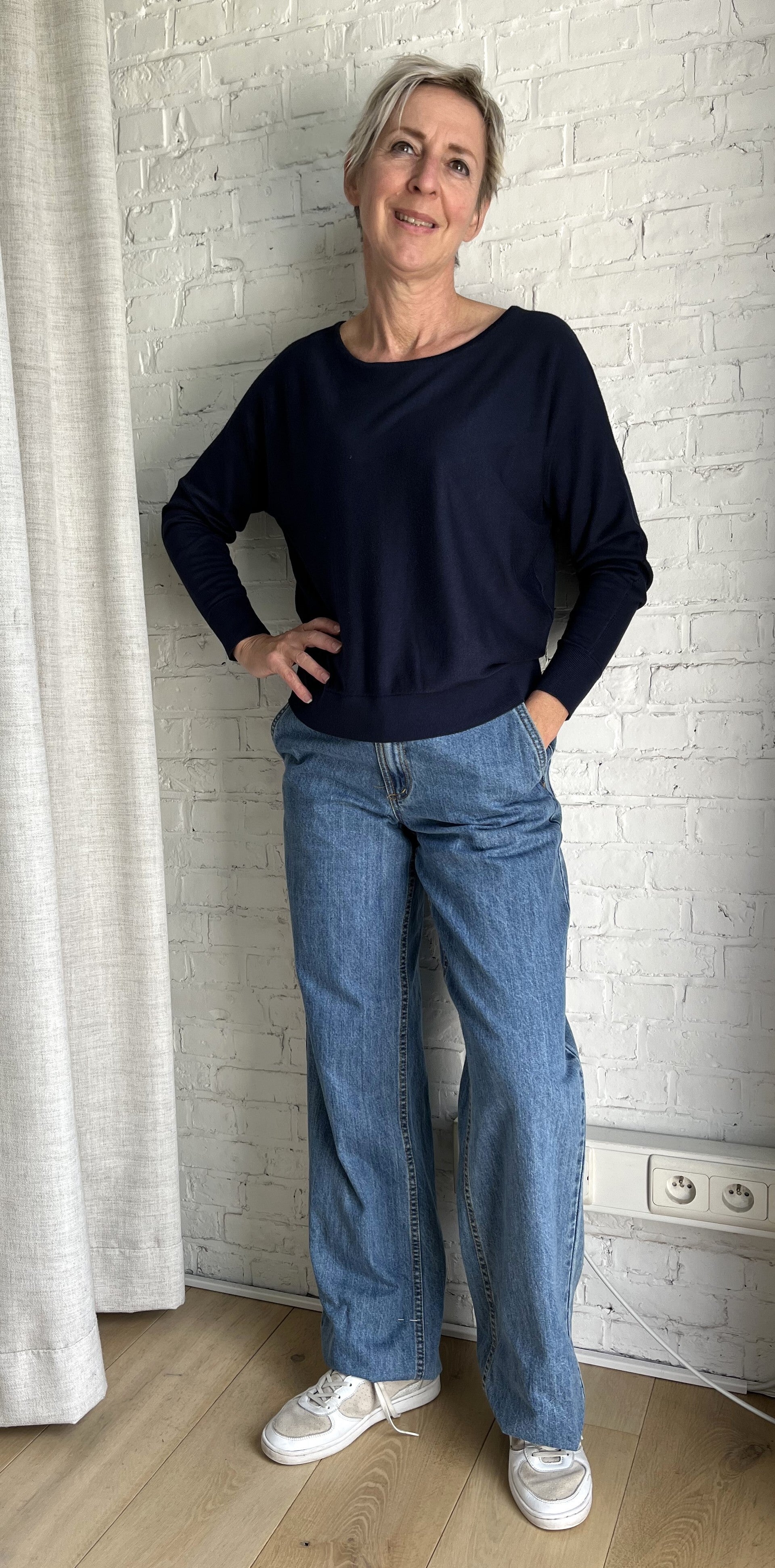 donkerblauwe dunne bamboe sweater met boothals en vleermuismouwen