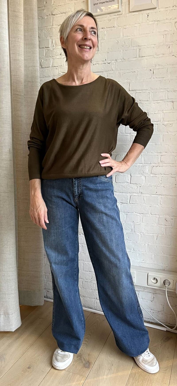 olijfkleurige dunne bamboe sweater met boothals en vleermuismouwen