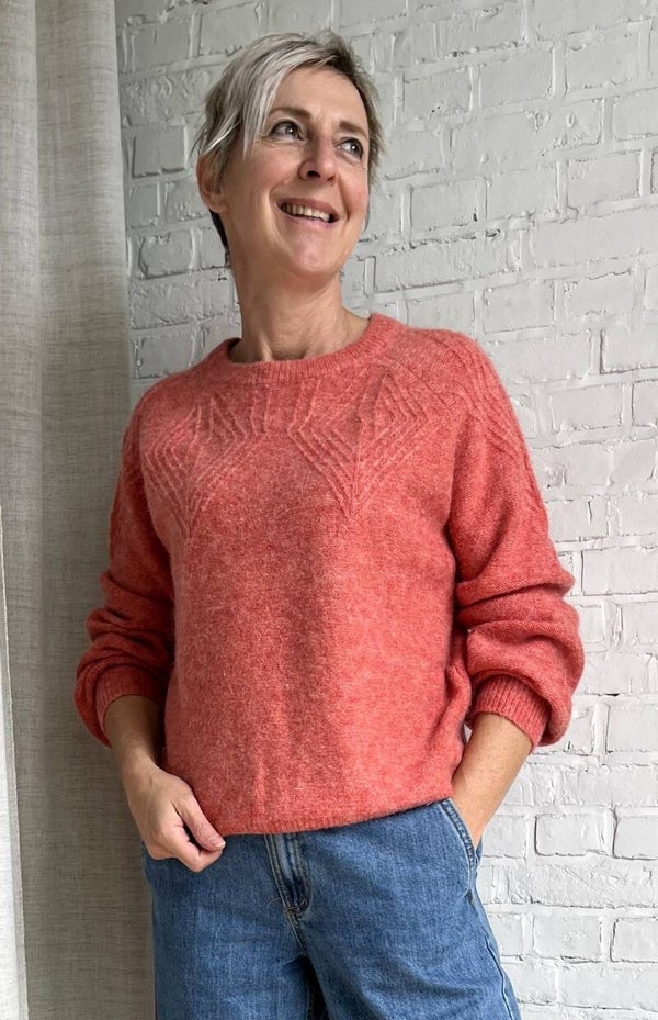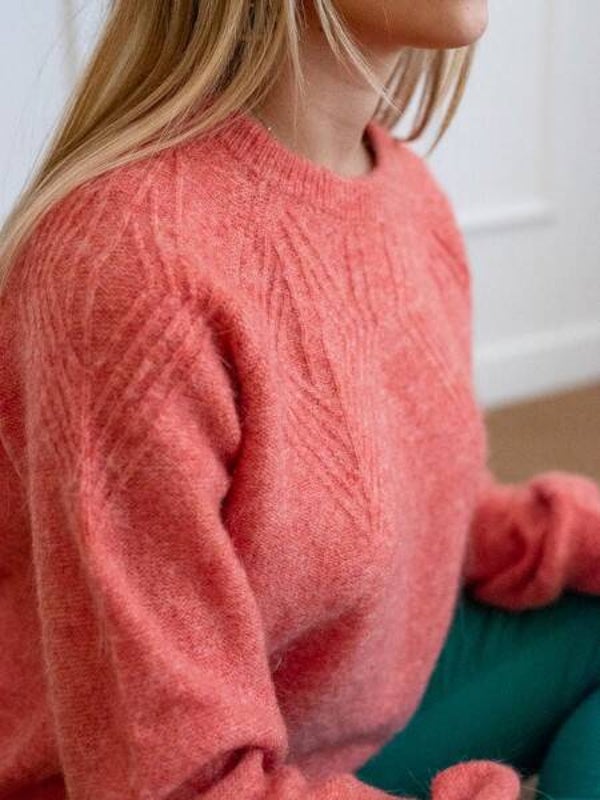Deze prachtige rode trui heeft een ronde hals en een geometrisch breipatroon bij de halslijn. Combineert gemakkelijk met een jeans