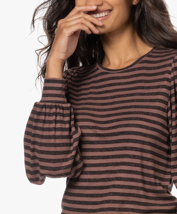 Gestreepte T-shirts vormen de casual ruggegraat van je T-shirtcollectie. Deze t-shirt is gemaakt van gemêleerd antracietgrijs met mauvekleurig gestreept ribjersey met viscose en linnen. De natuurlijke stretch van de ribjersey zorgt voor een slouchy aangesloten pasvorm. Ontworpen met lange mouwen en een ronde hals.