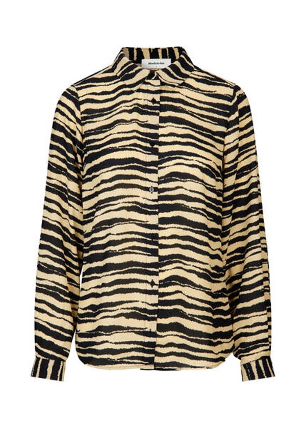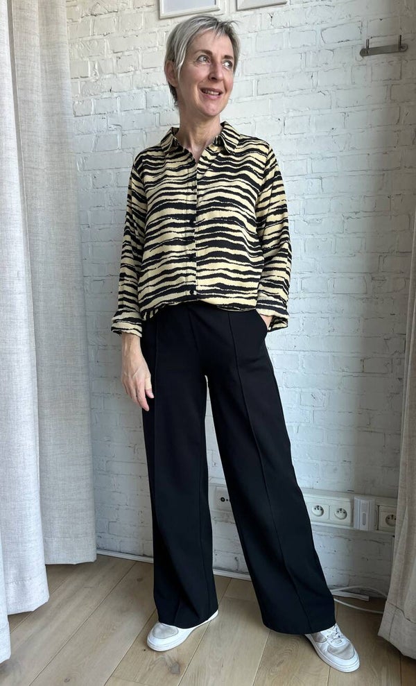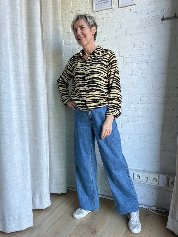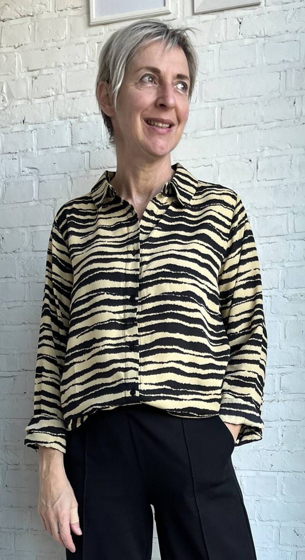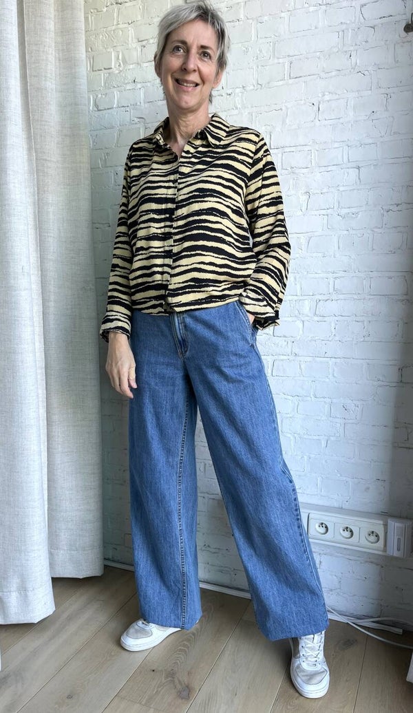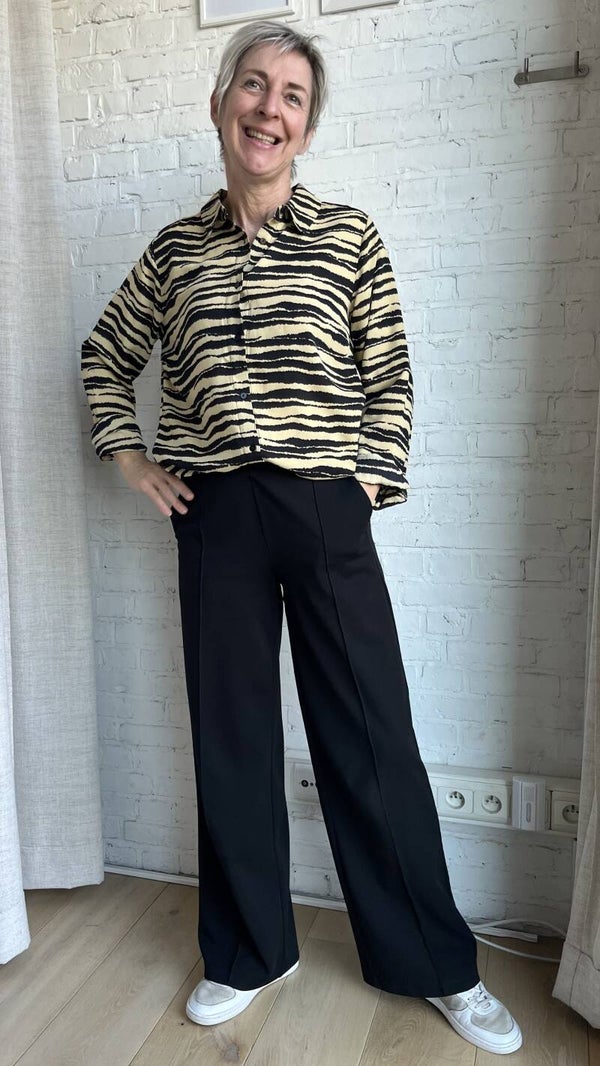 Prachtige oversized blouse met zebraprint. De blouse heeft een klassieke kraag, lange mouwen, en een knoopsluiting aan de voorkant. Ze is duurzaam gemaakt van 100% gerecycled polyester. Helemaal van deze tijd en makkelijk te combineren.