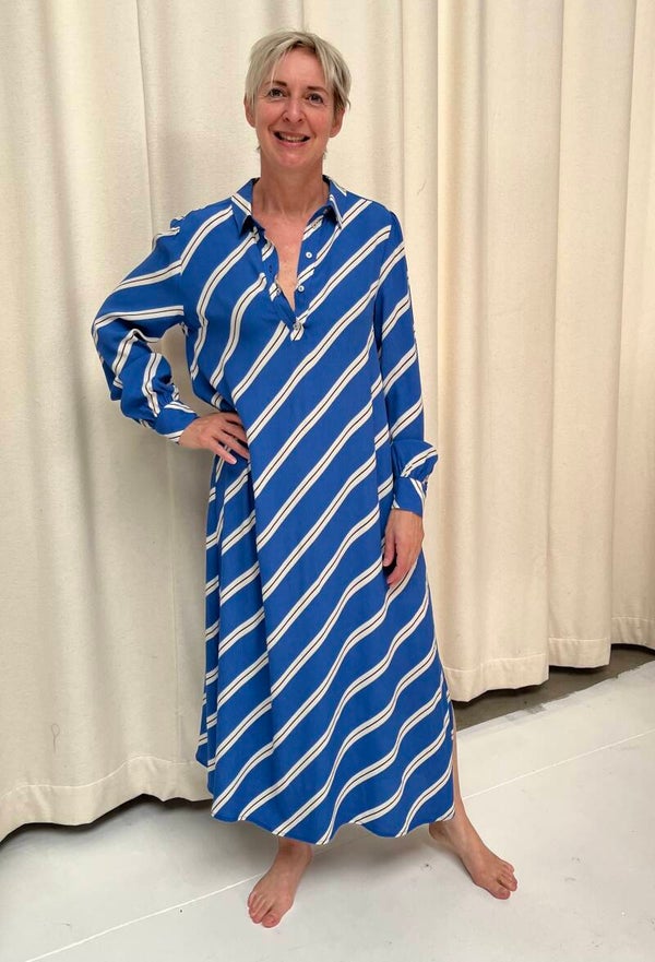 Azuurblauwe comfortabele gestreepte hemdsjurk. De jurk kan los gedragen worden of met het bijpassende lintje in de taille