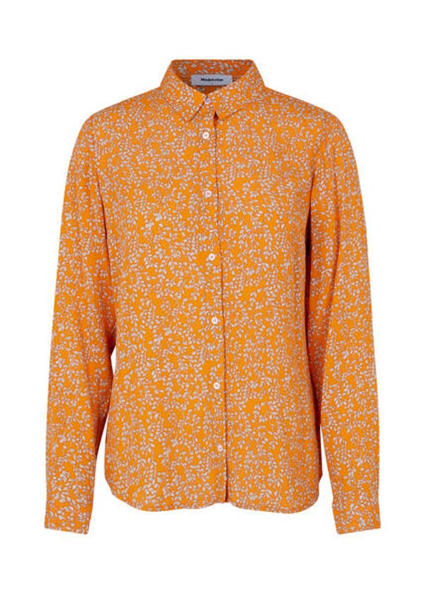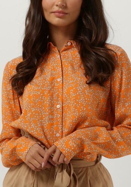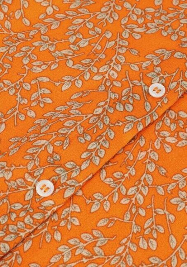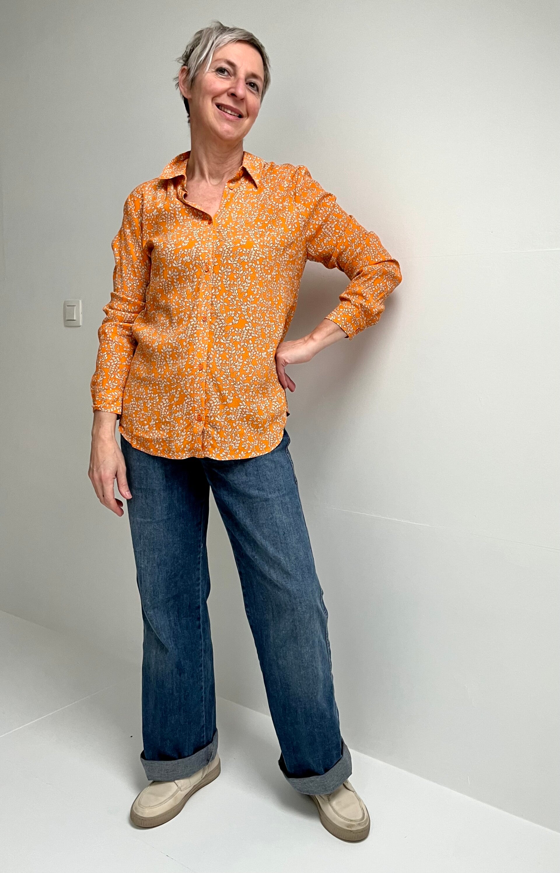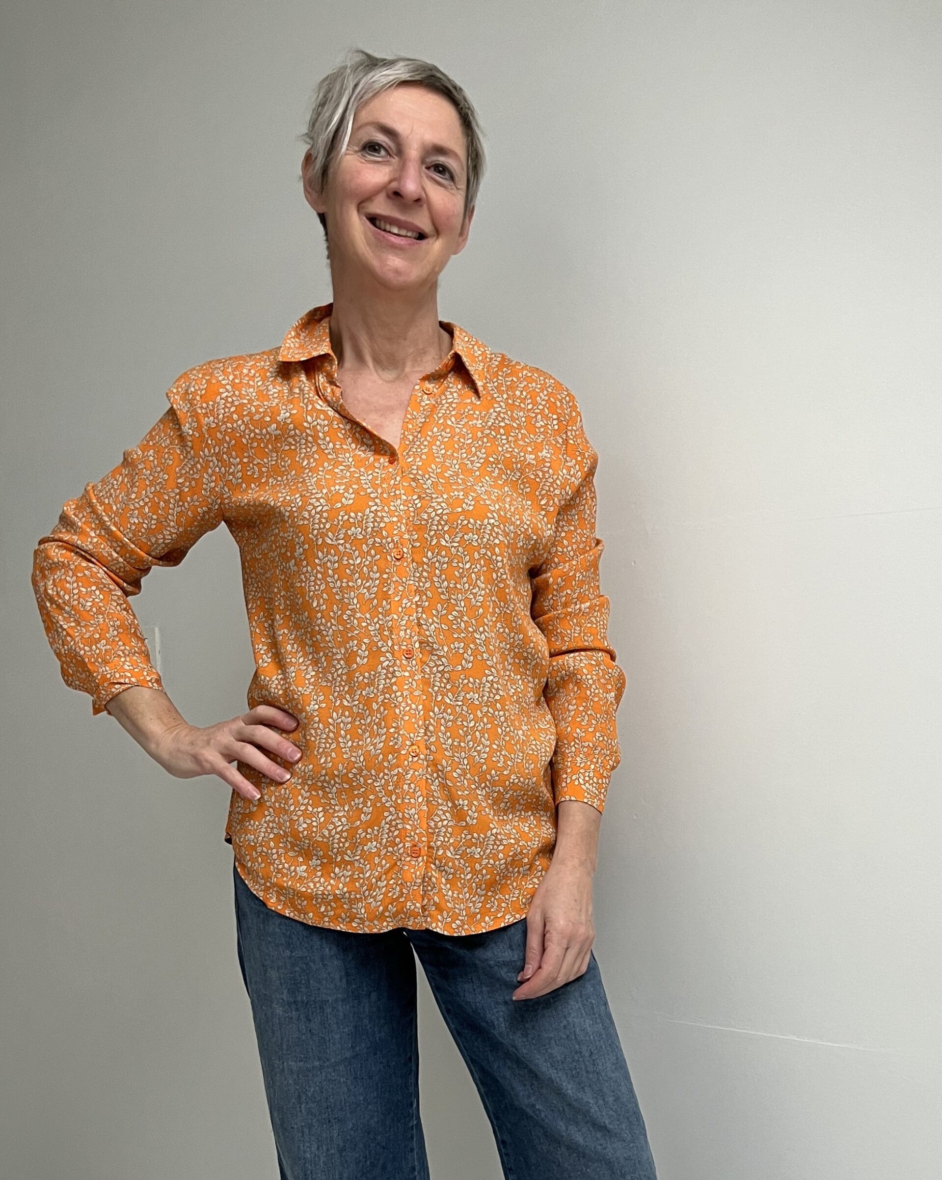 elegant comfortabel oranje bloemenbloesje. Het hemdje heeft een cremekleurige bloemenprint en volt soepel.
