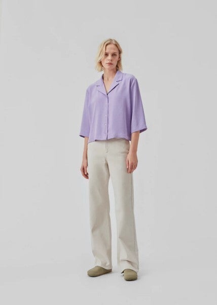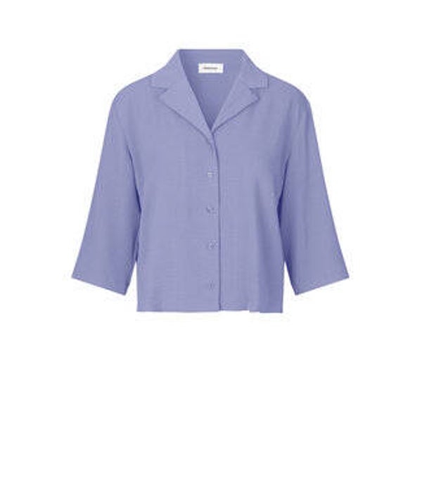 Lila hemdje in een soepelvallende stof. Het hemd heeft 3/4 mouwen en een v-hals