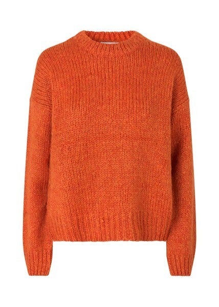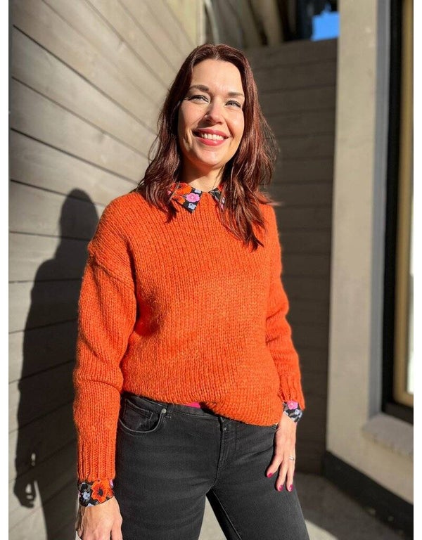 superzachte koraalkleurige trui met ronde hals. Heel mooi te combineren met bijpassende bloemetjes blouse of jurk