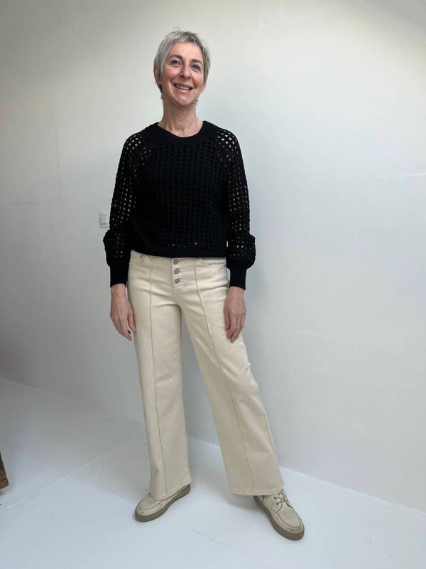 zwarte trui met gaatjespatroon. De trui heeft lange mouwen en een ronde hals Mooi om te stylen over een topje