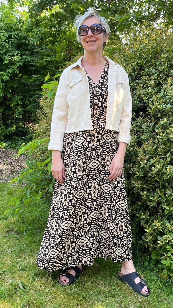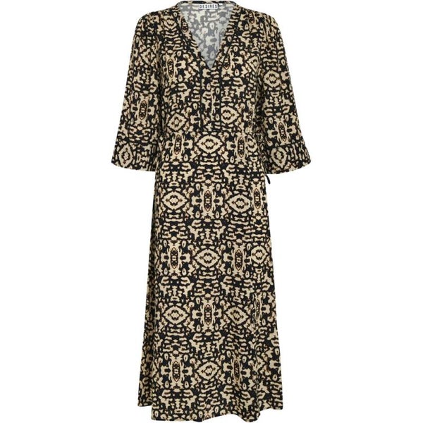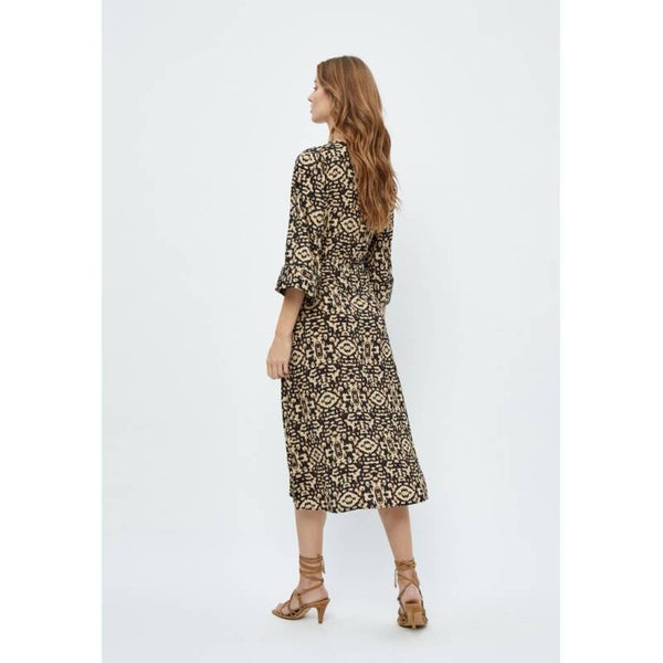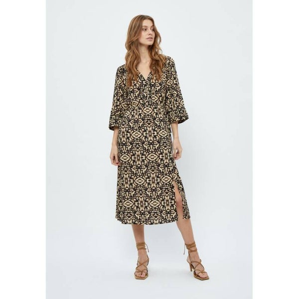 deze prachtige jurk met v-hals heeft een bruine etnische print en 3/4 mouwen. Kan zowel chique als casual gestyled worden