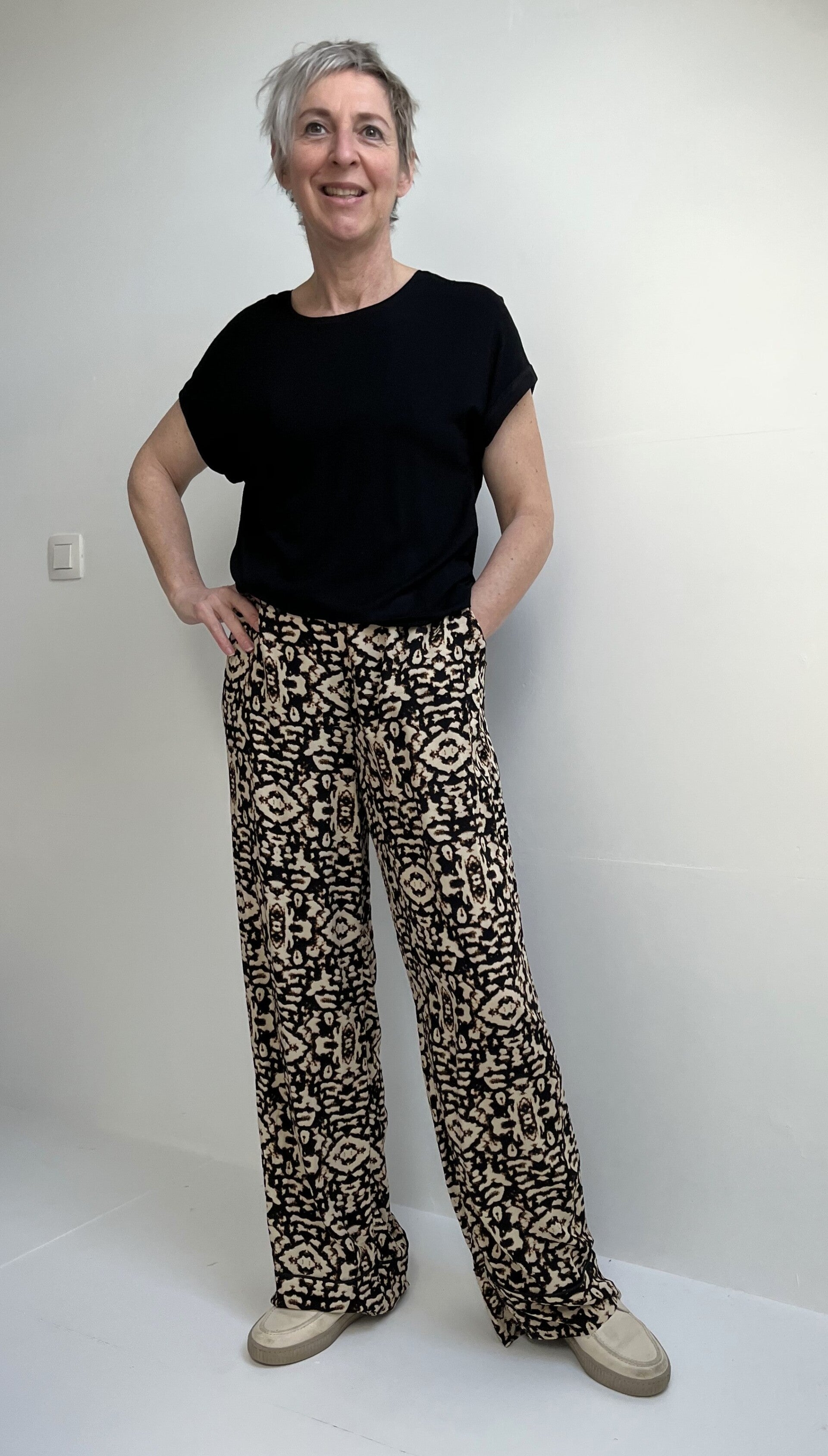 deze prachtige broek met wijde pijpen is een echte bestseller. De broek heeft een mooi etnisch patroon en de stof valt zeer soepel.