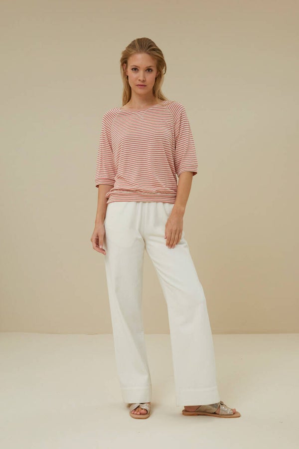 Deze top is een comfortable top met een losse pasvorm. Hij heeft een ronde halslijn en korte mouw die iets langer valt dan normaal. De top is afgewerkt met een rib boord aan zowel de onderkant van de mouw als aan de onderkant van de top. Deze comfy basis is gemaakt van 100% katoen en is een echte must-have essential.