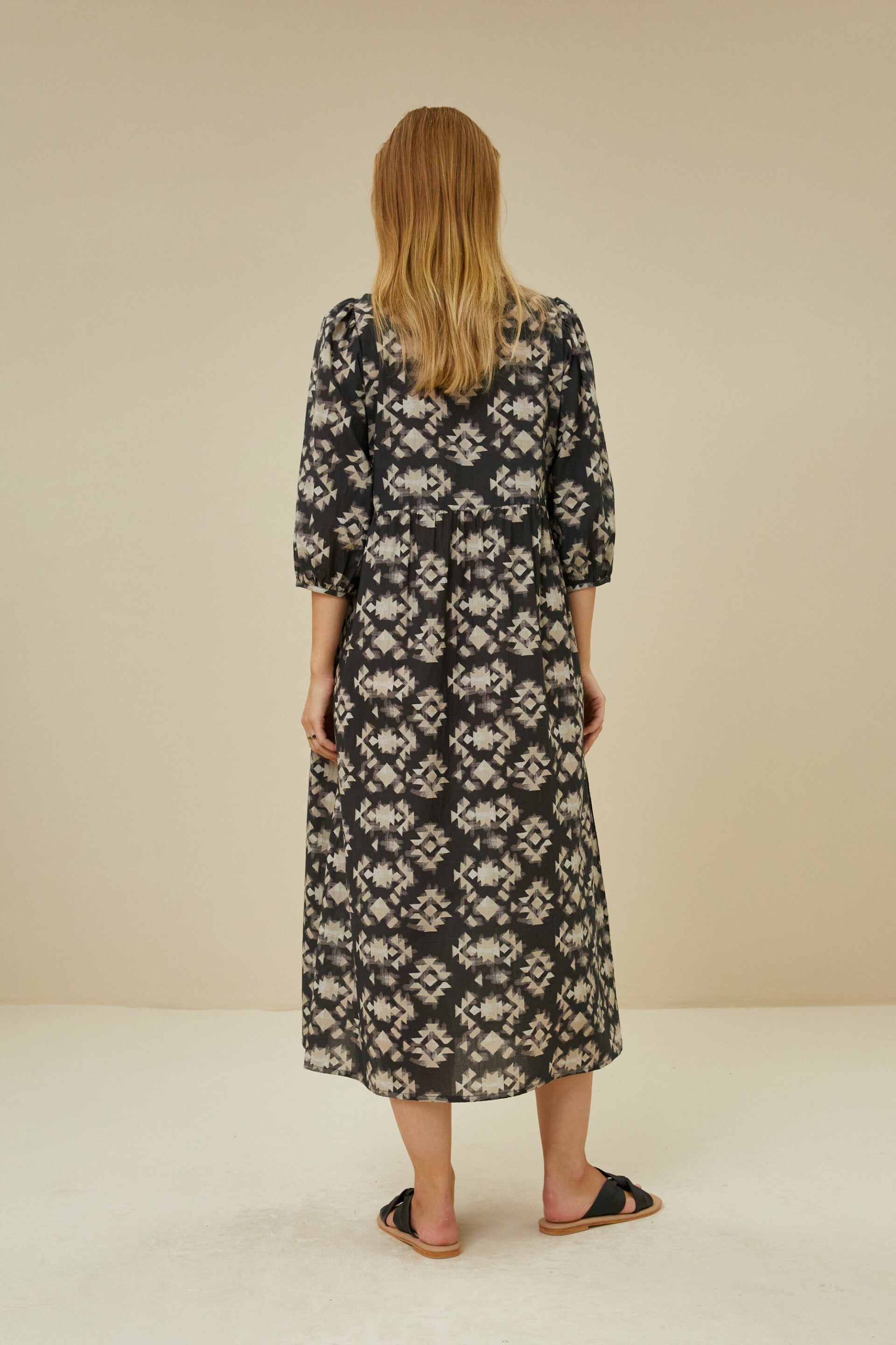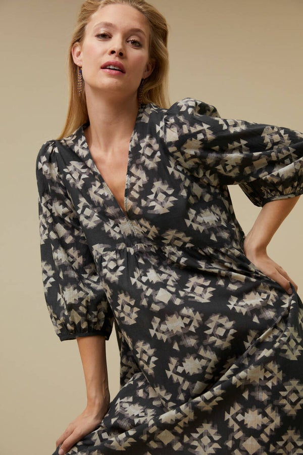 Wij zijn op slag verliefd op de vrouwelijke cozy stijl van deze luchtige jurk. Dit kleedje is gemaakt van 100% katoen in een elegante losse pasvorm. De v-halslijn, pofmouwen en maxi lengte zorgen ervoor dat de jurk mee zal zwieren. Hij heeft plooien onder de borst en verborgen steekzakken. Combineer met een zomerse sandaal of stoere sneaker om de look compleet te maken.